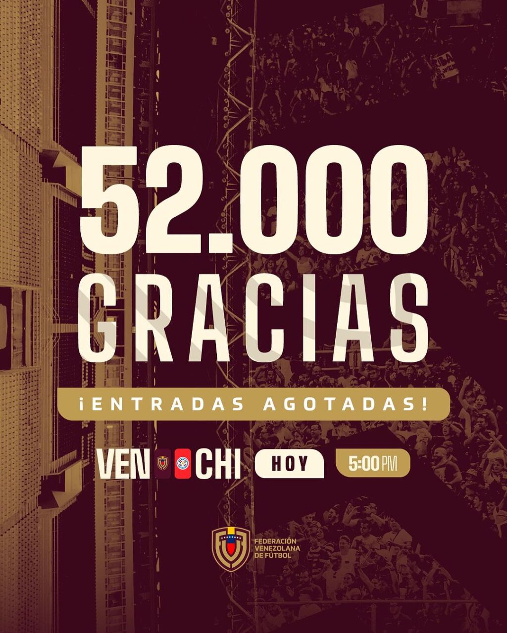 Por su parte La Federación Venezolana de Fútbol (FVF), anunció en su cuenta de instagram que las entradas al Monumental de Maturín ya están agotadas, «𝟓𝟐.𝟎𝟎𝟎 𝐂𝐎𝐑𝐀𝐙𝐎𝐍𝐄𝐒 𝐉𝐔𝐍𝐓𝐎𝐒. Hoy será una 𝒇𝒊𝒆𝒔𝒕𝒂 𝒗𝒊𝒏𝒐𝒕𝒊𝒏𝒕𝒐 en el Monumental. 𝑯𝒂𝒓𝒆𝒎𝒐𝒔 𝒉𝒊𝒔𝒕𝒐𝒓𝒊𝒂 aquí, en cada rincón de Venezuela y en todo el mundo», describe el post de la cuenta.