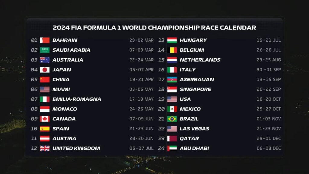 La temporada 2024 de la F1 iniciará el 29 de febrero de 2024 con los entrenamientos libres de Bahrein.