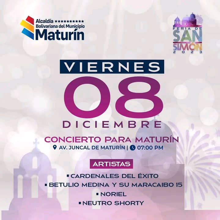 Como parte de las actividades programadas del 5 al 8 de diciembre con motivo del aniversario 263 de la ciudad de Maturín se llevarán a cabo una serie de actividades dentro de las cuales destaca la presentación de reconocidos artistas como Cardenales del Éxito, Betulio Medina y su Maracaibo 15, Noriel y Neutro Shorty.
