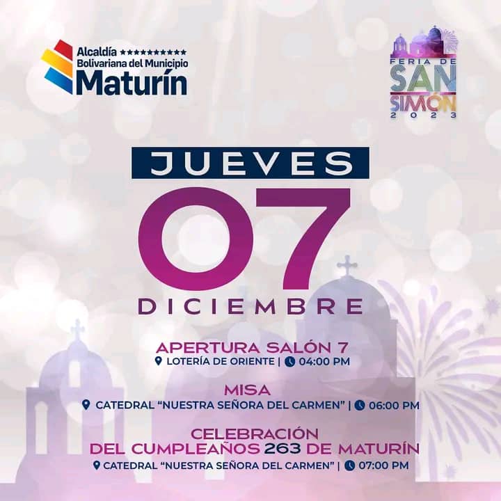 De igual manera, el 7 de noviembre, a partir de las 4 de la tarde se dará la apertura al Salón 7, en la sede de la Lotería de Oriente. Seguidamente, a las seis se celebrará en la Catedral a Nuestra Señora del Carmen la misa de Acción de Gracia oficiada por el padre Samael Gamboa. En este mismo lugar está pautada la gran celebración por el cumpleaños de la ciudad.