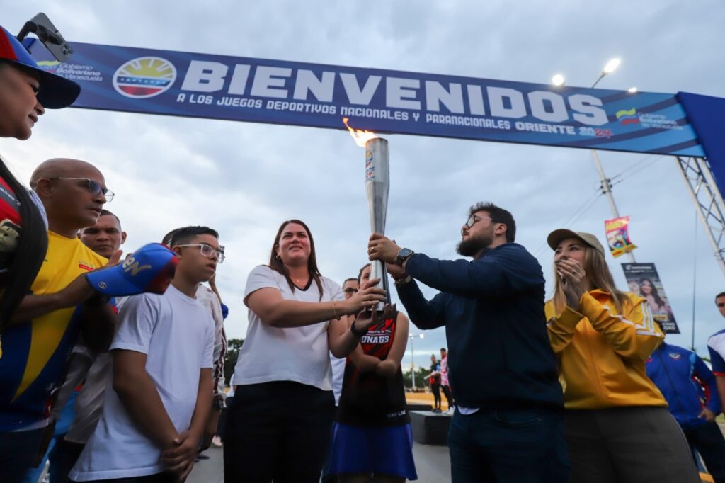 El gobernador Luna y demás autoridades presentes recibieron la llama olímpica junto a los atletas Anmar Molina y Daniela Regel, ciclistas, y Jhoslenis Bastardo y Jesús Marcano, ambos de Deporte Adecuado-Down. La antorcha fue colocada en pebetero dispuesto en la plaza Generalísimo Francisco de Miranda, por Ángel Rodríguez, destacado representante de la disciplina de levantamiento de pesas, y las autoridades presentes.